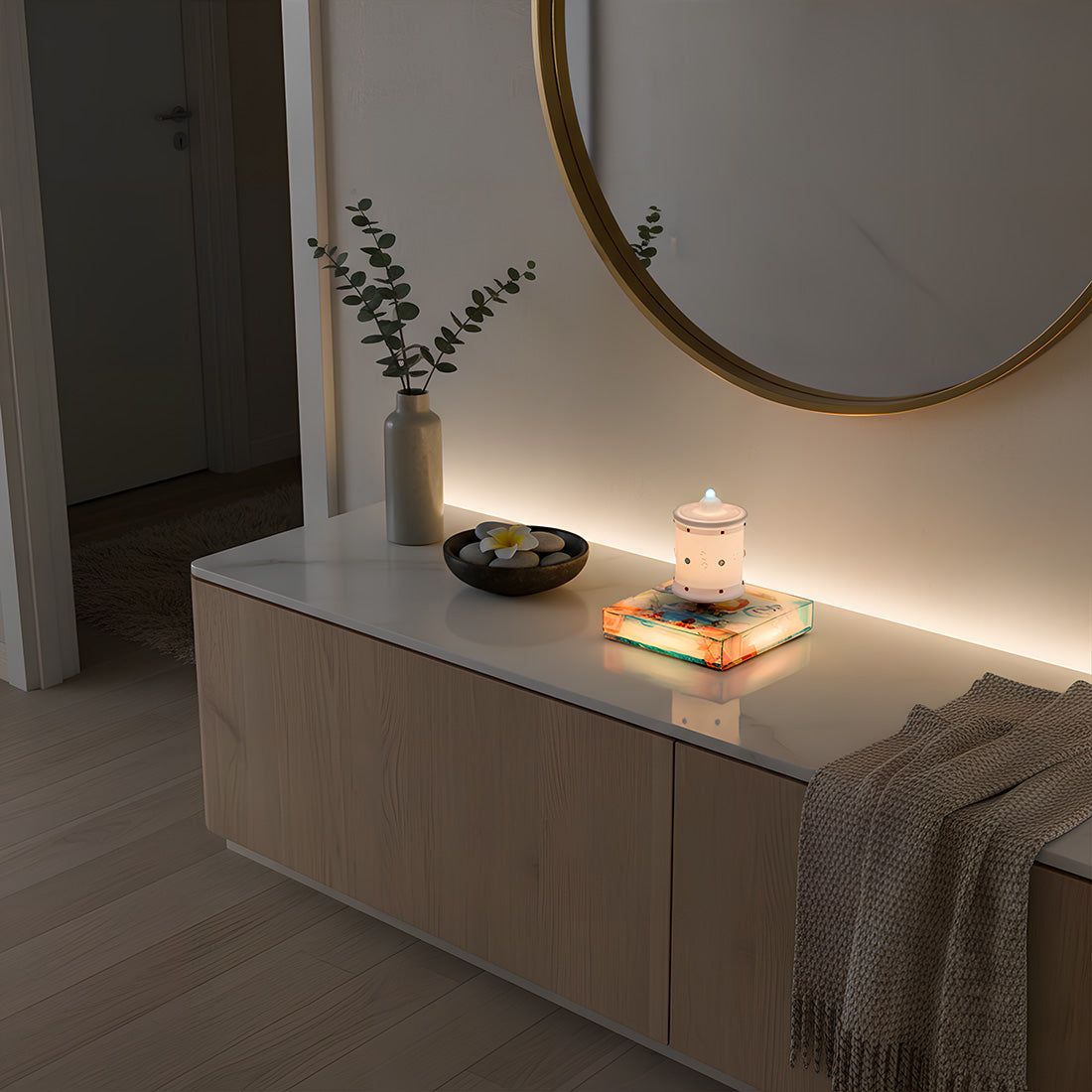 • Dynamic Ambient Lighting: The luminous base transitions through a spectrum of soft, calming colors (including warm orange/red, deep blues, purples, and greens, as shown in the images). This dynamic lighting creates a serene backdrop that enhances relaxation and introspection.