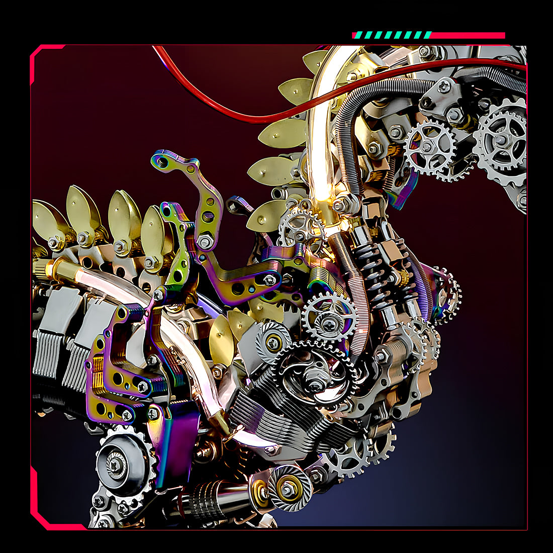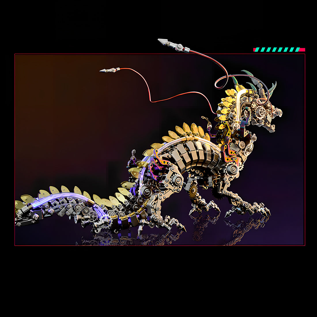 At first glance, I was stunned by its powerful presence and intricate structure. The designer seamlessly merged the majestic posture of an Eastern dragon with Western steampunk mechanical elements. Every scale, every joint, every whisker is cleverly constructed from countless precise gears, rivets, connecting rods, and metal plates, showcasing incredible complexity and craftsmanship. The exposed wires and pipes, far from appearing messy, add a vivid sense of mechanical life, as if it could roar to life at any moment.