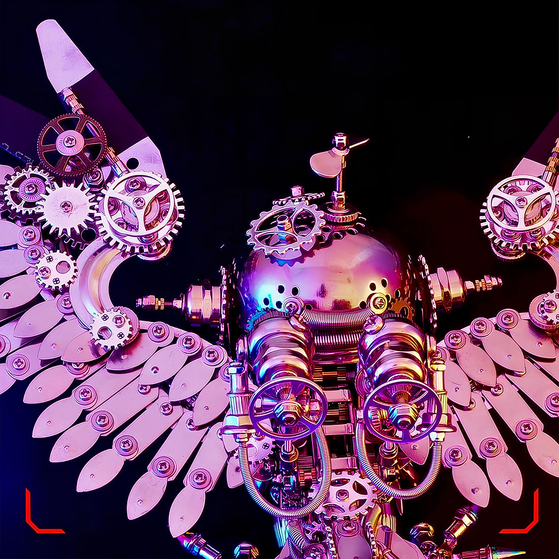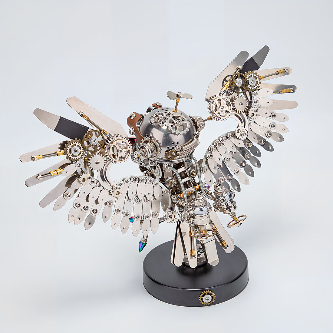 Intricate Steampunk Design:Adorned with pilot goggles, mechanical gears, and layered steel feathers, capturing the essence of a futuristic predator.