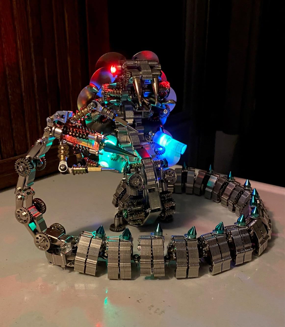 This mechanical python model is absolutely awesome! It's more than just a model; it's like a futuristic piece of art. The lighting effects are stunning, emitting a unique technological and mysterious glow in the dark, and the details are impeccably done. The combination of gears and chains makes the entire shape dynamic and full of tension. The assembly process was challenging but incredibly fun, with each step bringing a huge sense of accomplishment. The finished product is definitely an eye-catching centerpiece in any home. Highly recommended for all who love mechanics, sci-fi, and unique display pieces!