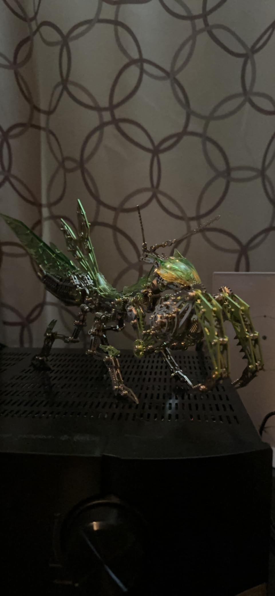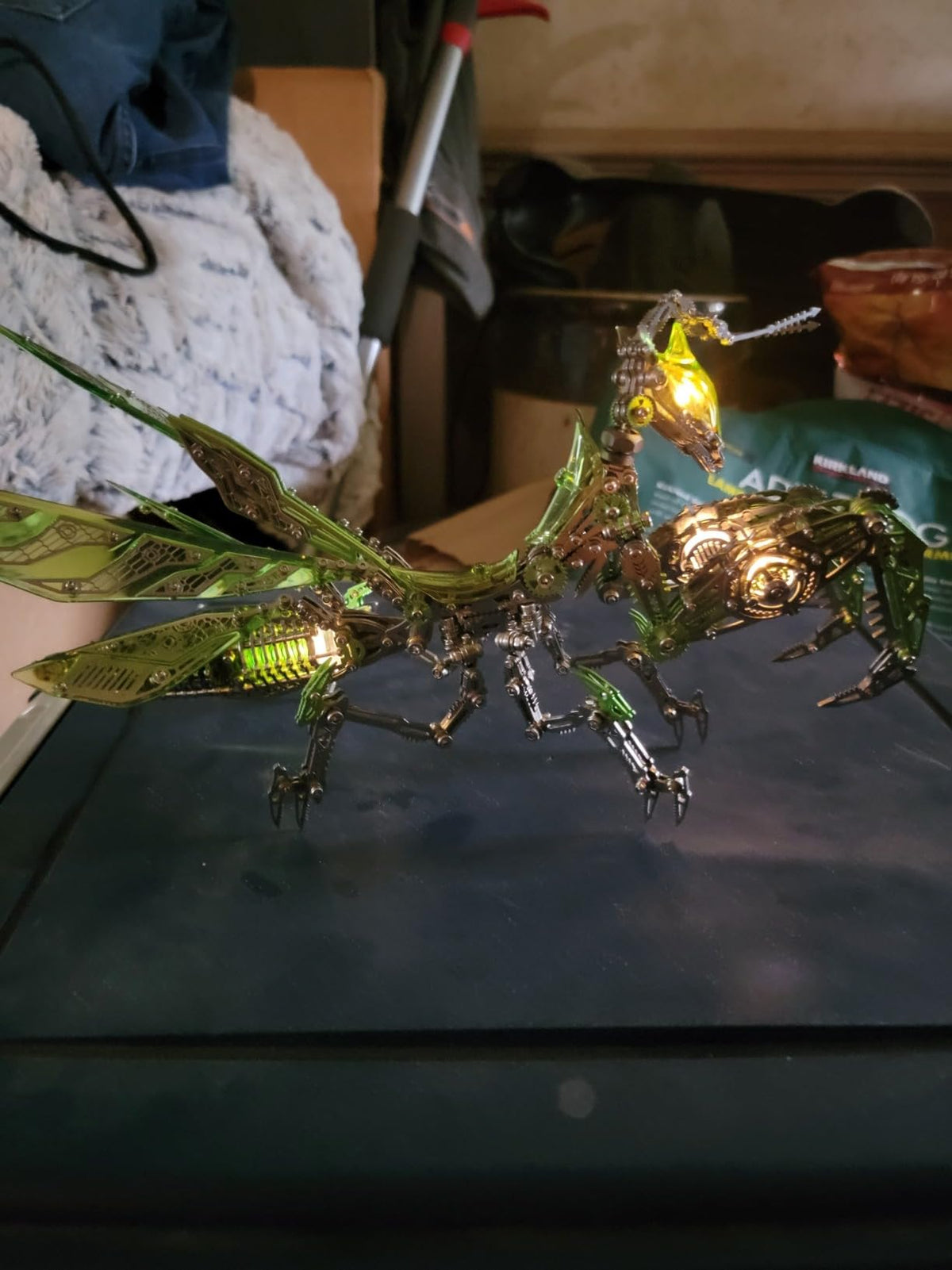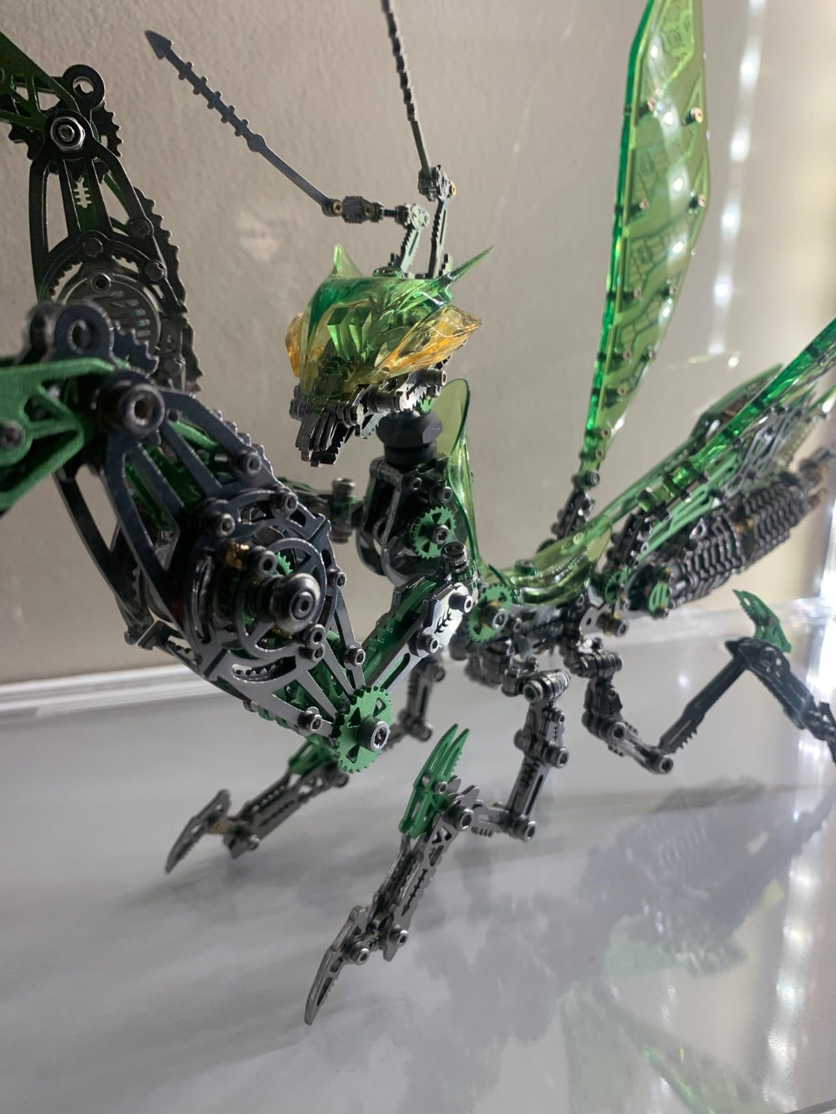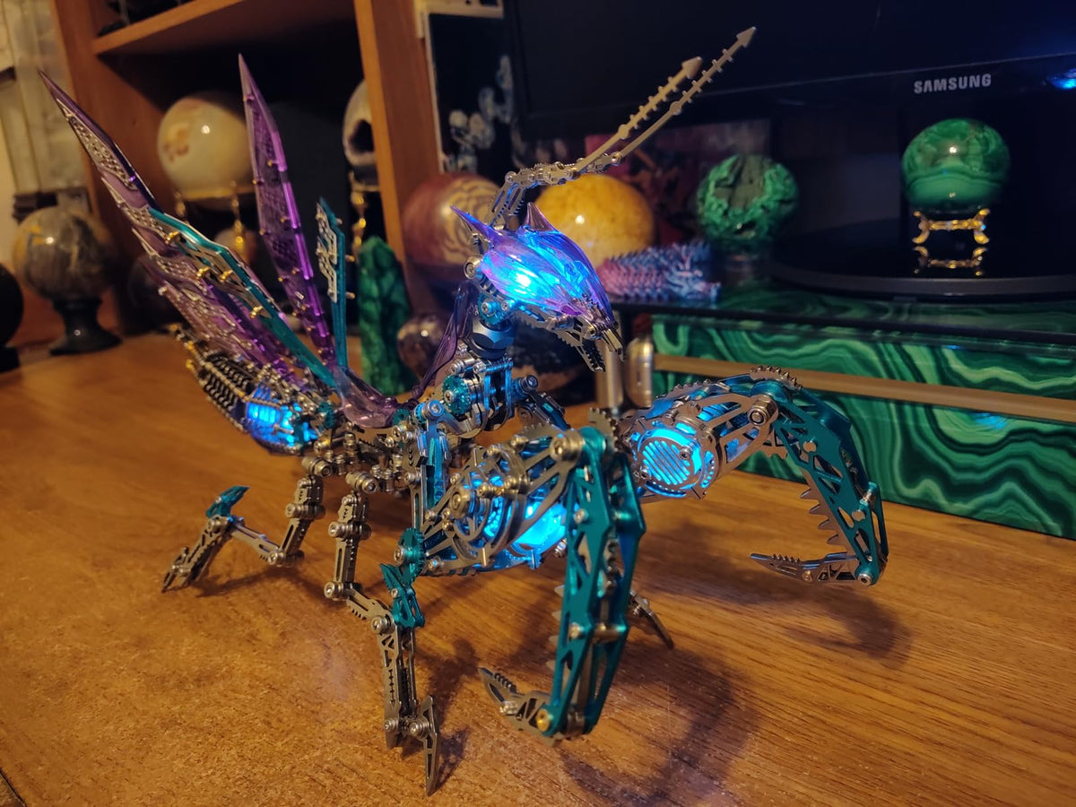 I spent a relaxing afternoon assembling this mantis while watching TV. The build process was engaging and intricate. Using tweezers really helped with the smaller screws and gears. The moment I turned on the lights, I was blown away. The translucent green wings combined with the internal LEDs look absolutely radioactive and cool. It’s huge and looks impressive on my table!
