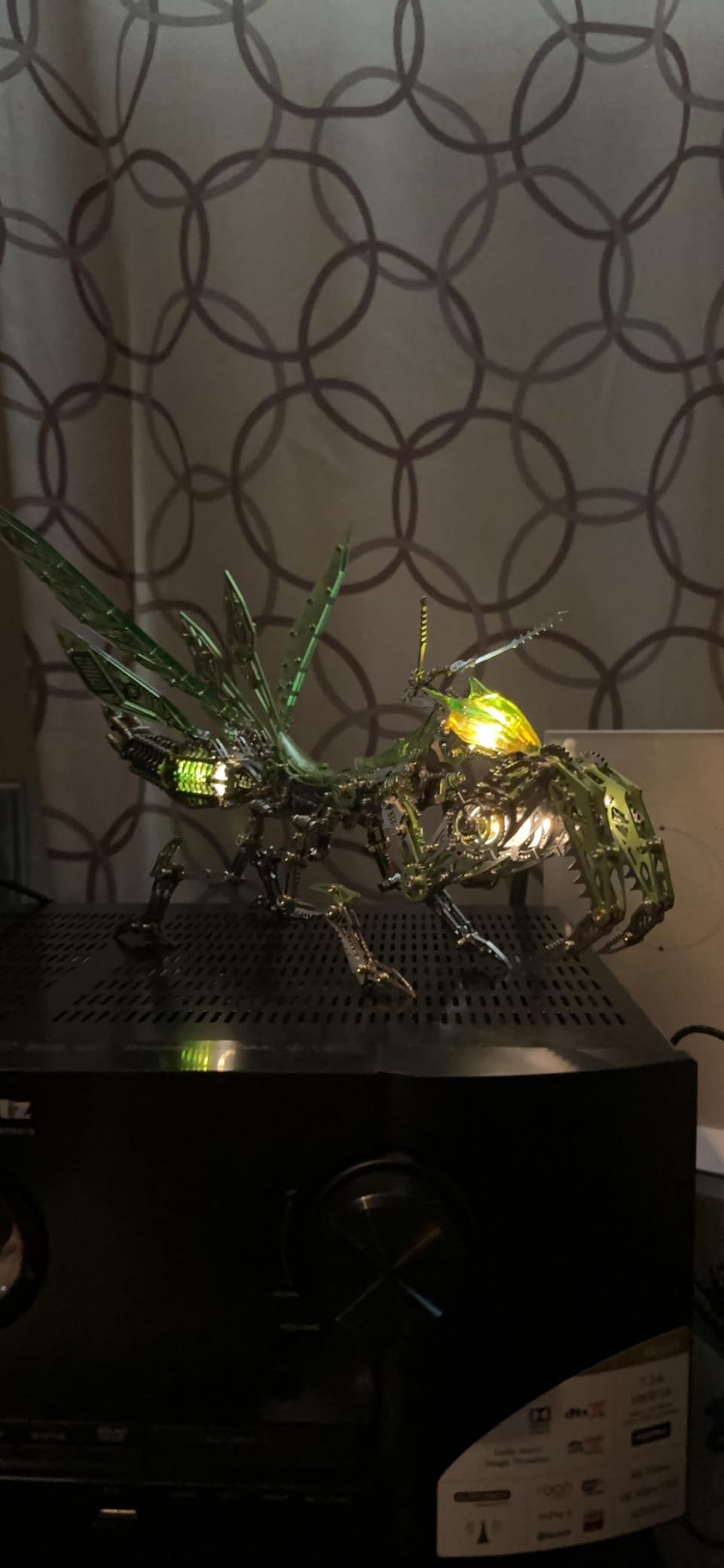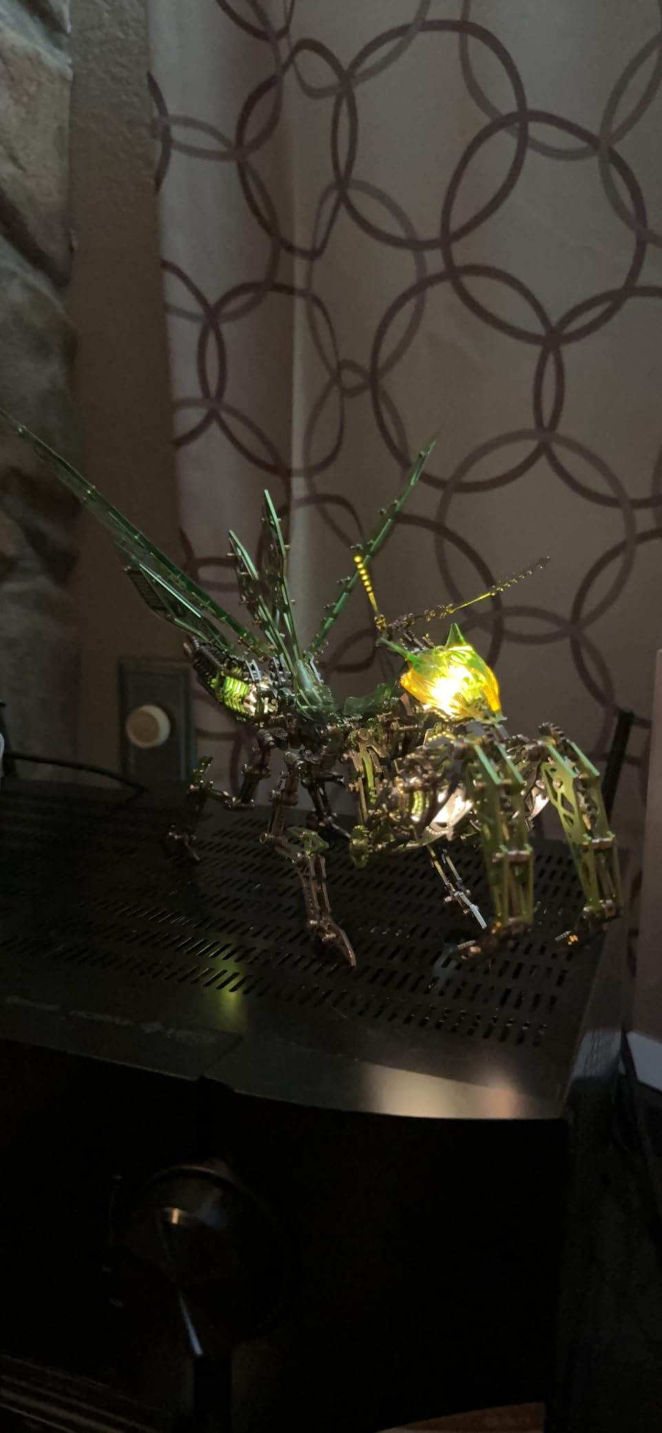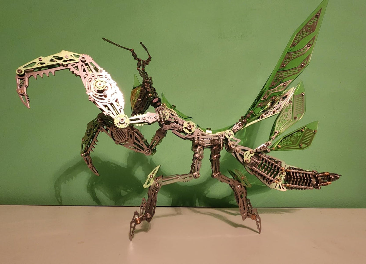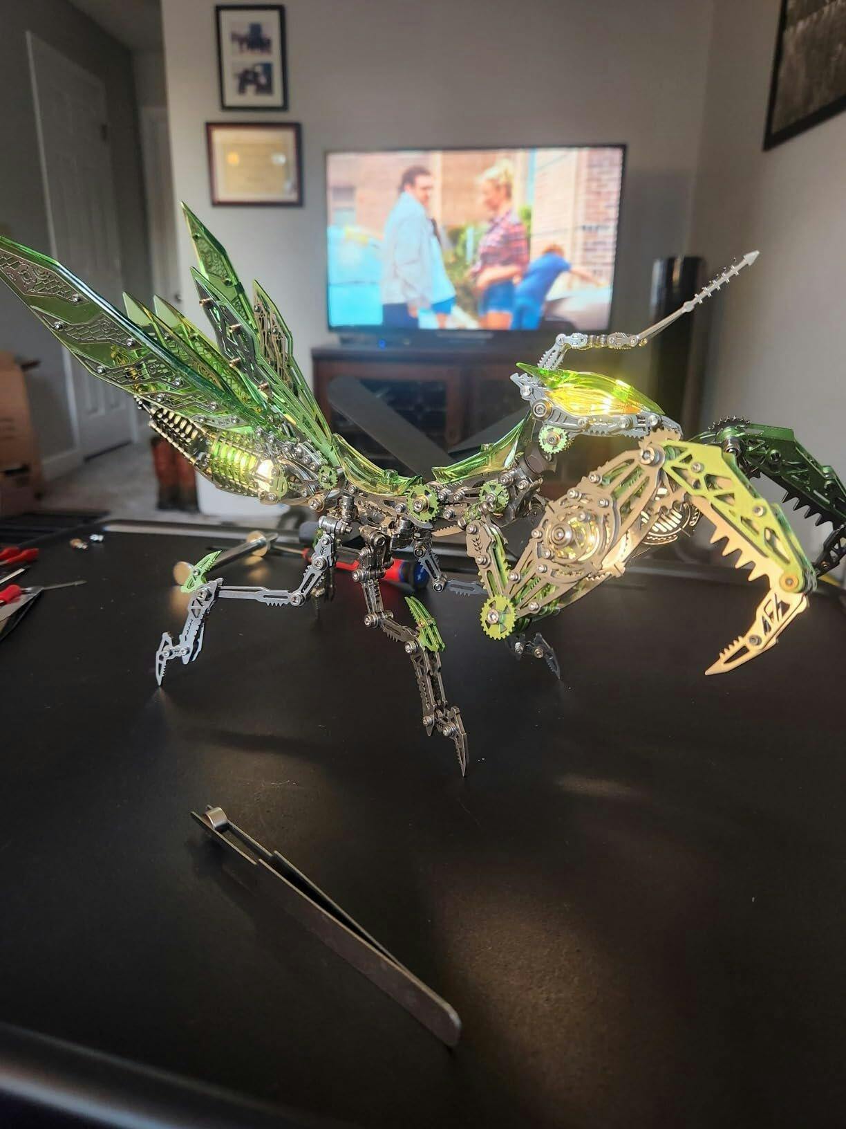 I spent a relaxing afternoon assembling this mantis while watching TV. The build process was engaging and intricate. Using tweezers really helped with the smaller screws and gears. The moment I turned on the lights, I was blown away. The translucent green wings combined with the internal LEDs look absolutely radioactive and cool. It’s huge and looks impressive on my table!