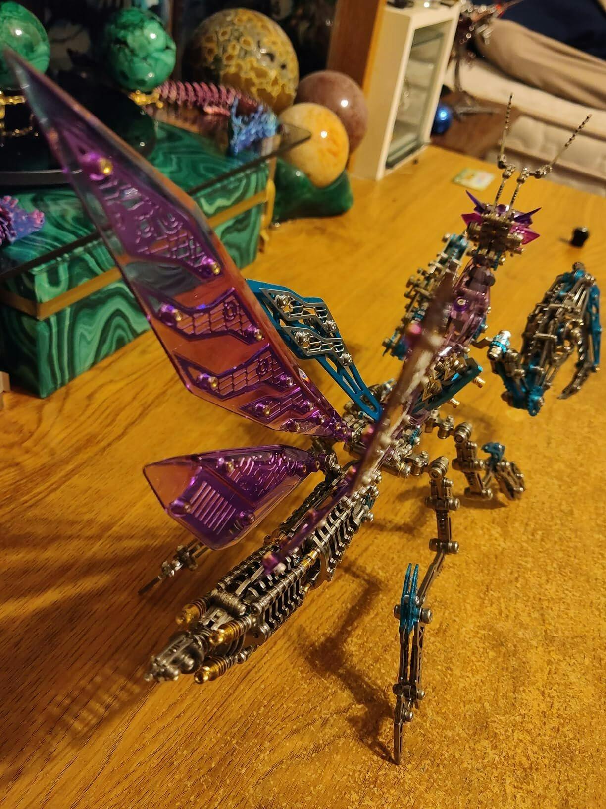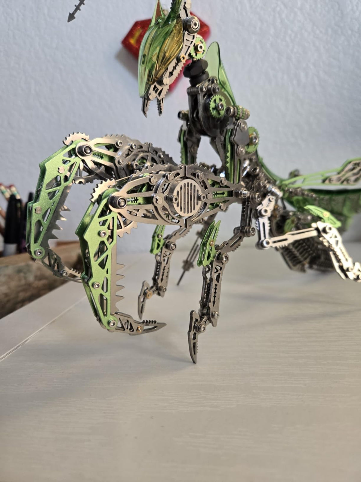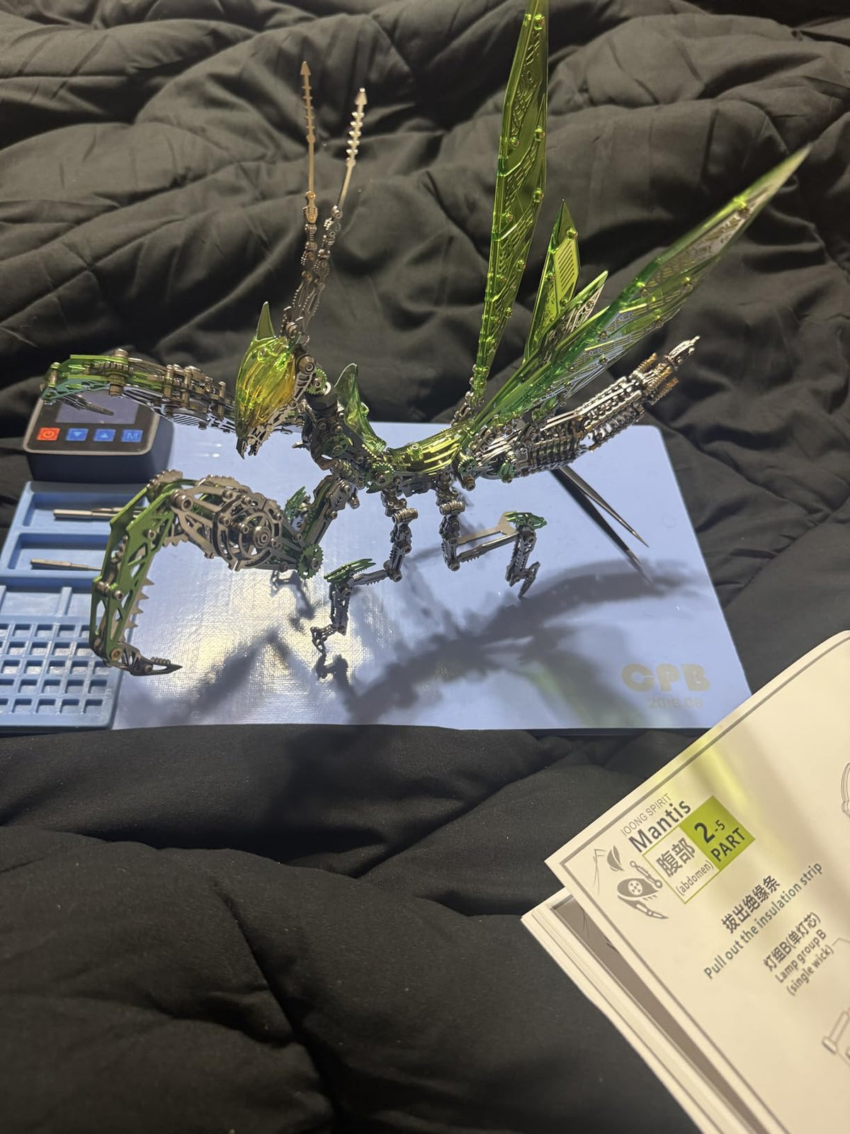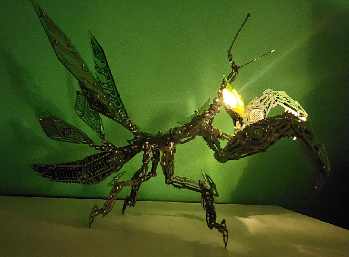 I spent a relaxing afternoon assembling this mantis while watching TV. The build process was engaging and intricate. Using tweezers really helped with the smaller screws and gears. The moment I turned on the lights, I was blown away. The translucent green wings combined with the internal LEDs look absolutely radioactive and cool. It’s huge and looks impressive on my table!