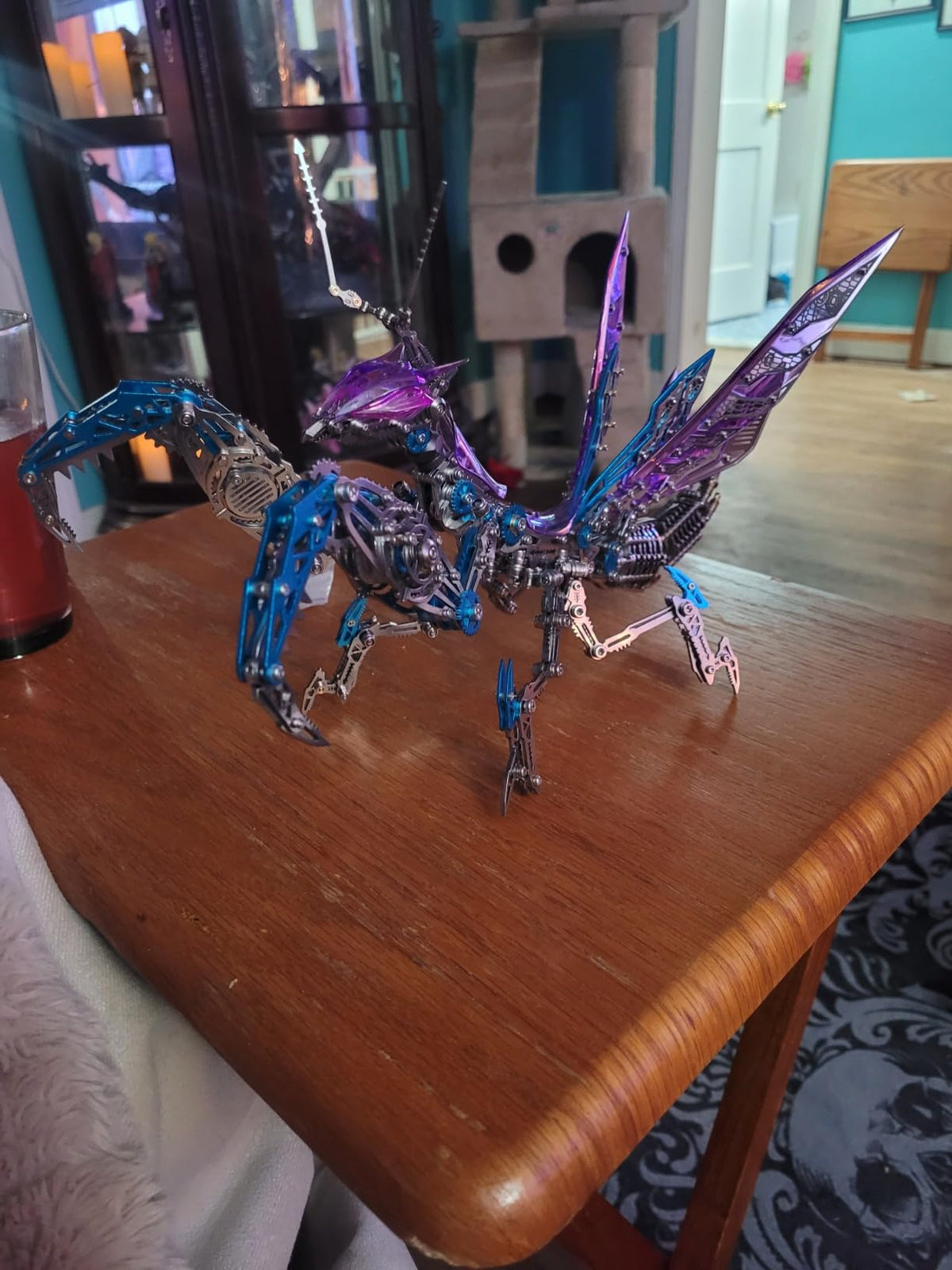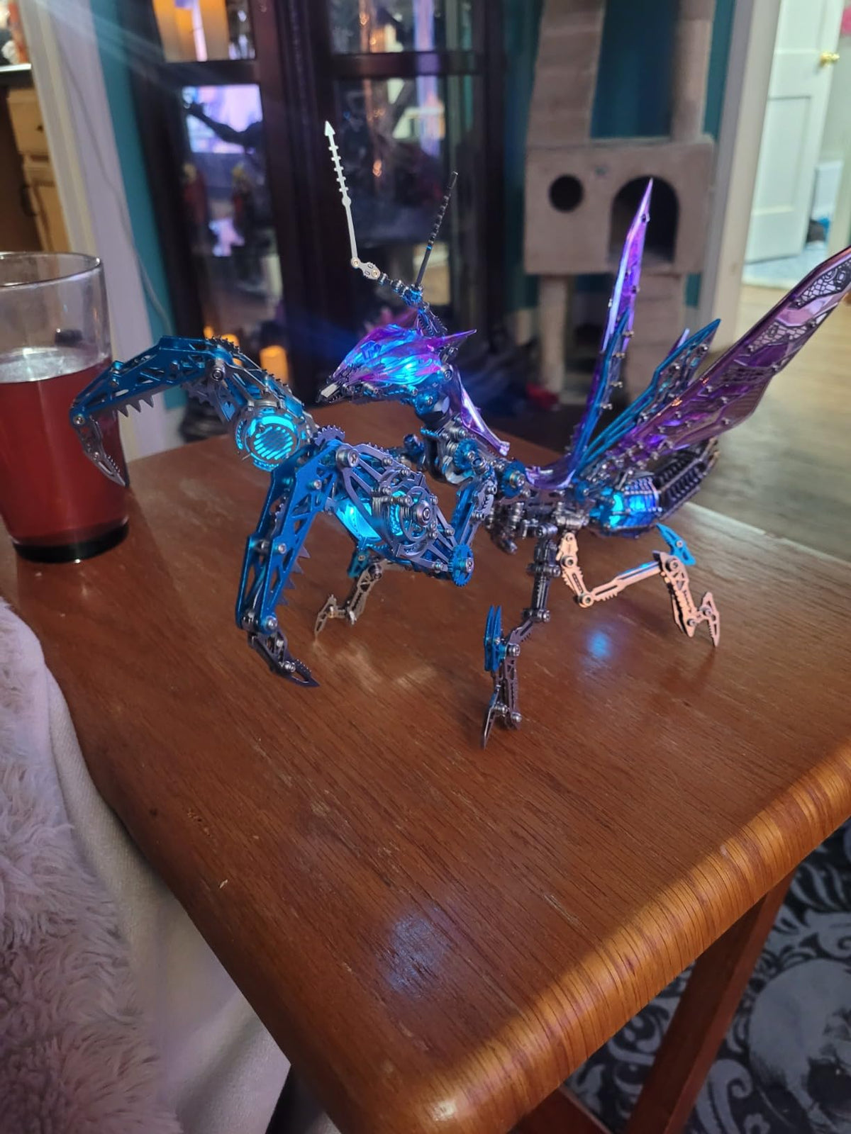 This mechanical mantis model provided a truly great assembly experience. The design of the model is quite ingenious, with purple-blue tones and translucent wings that give it a very futuristic look. While the assembly process required some patience and meticulousness, the instructions were very clear, and the parts were well-finished, with no burrs or mismatches found. The final product is very beautiful and makes a unique decorative piece on my desk. If you enjoy hands-on projects and have an interest in mechanical aesthetics, this model is definitely worth trying.