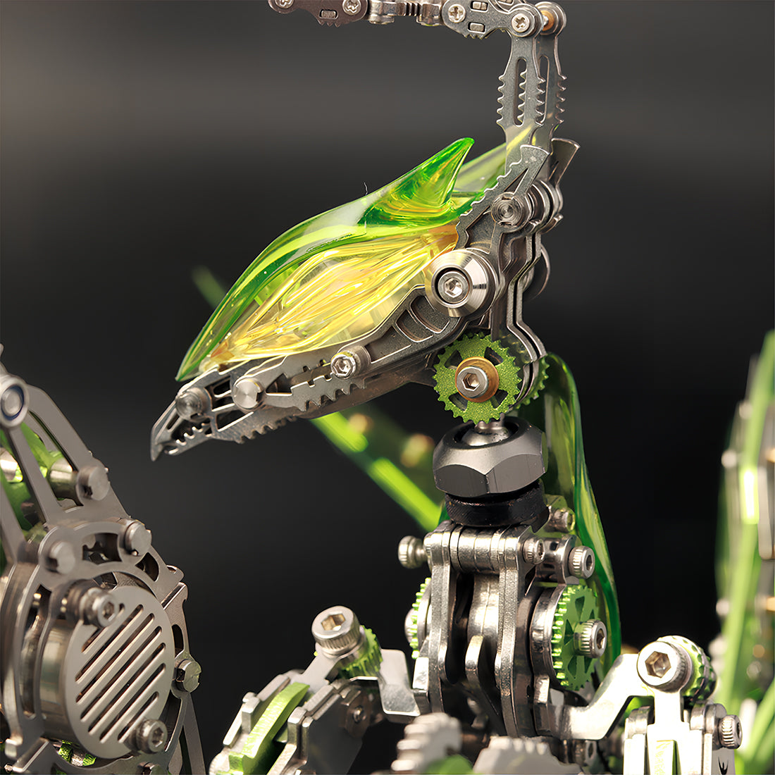 This mechanical mantis model is absolutely amazing! The combination of translucent green wings and a metallic body is incredibly clever, giving it both the fluidity of a living creature and a futuristic tech aesthetic. The attention to detail is outstanding, especially the lighting effects on the head and body, which make the entire model look exceptionally cool in dim lighting. The finished piece is very sturdy and makes a striking display on any desk—a must-have collectible for mechanical model enthusiasts.