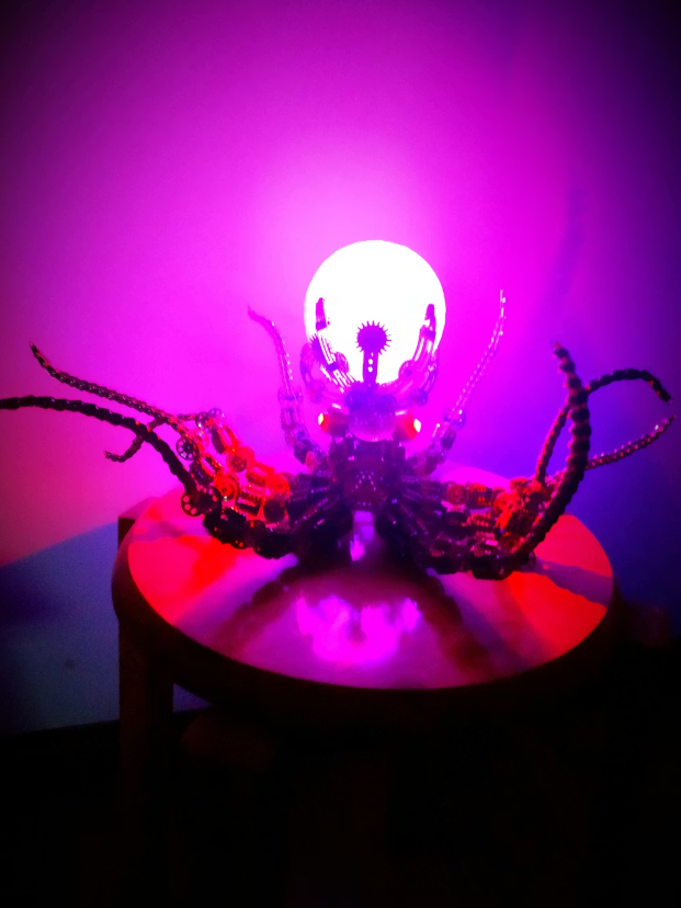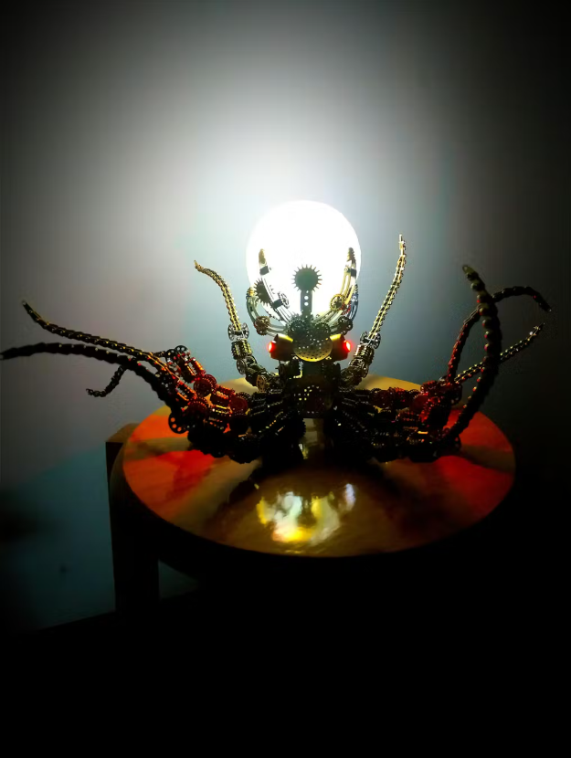 The “moon lamp” head is the absolute best part of the whole piece. Its soft glow perfectly complements the steampunk vibe of the metallic tentacles.