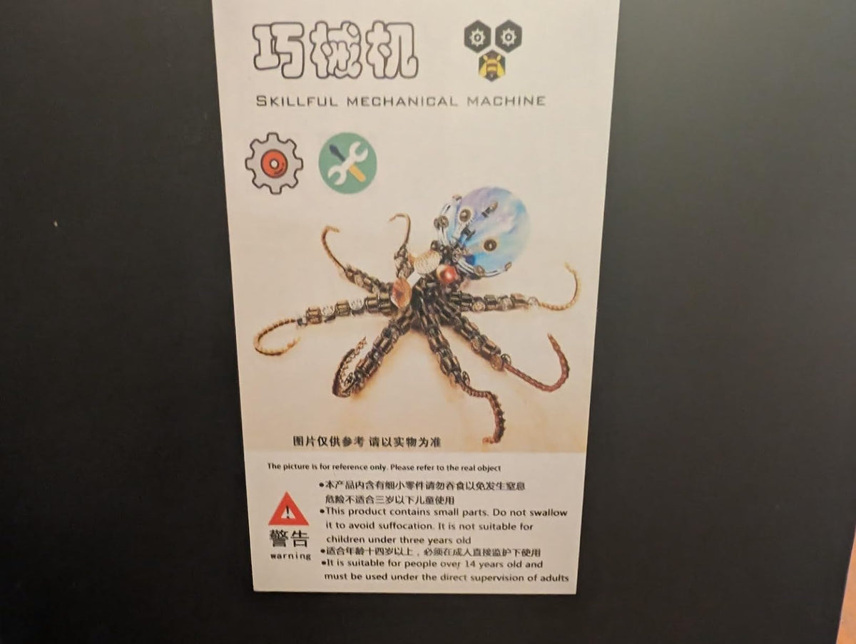 I bought this mechanical octopus kit as a weekend DIY project. The quality of the metal parts impressed me—they feel substantial in the hand, and all components are neatly bagged by number, which is very helpful. However, I'm giving it four stars instead of five because the assembly process was quite challenging. The screws and gears are incredibly tiny—you absolutely need tweezers and steady hands. It consists of numerous metal blocks, and I disassembled and reassembled it a couple of times. It took much longer than I anticipated, but seeing the finished product was incredibly rewarding.