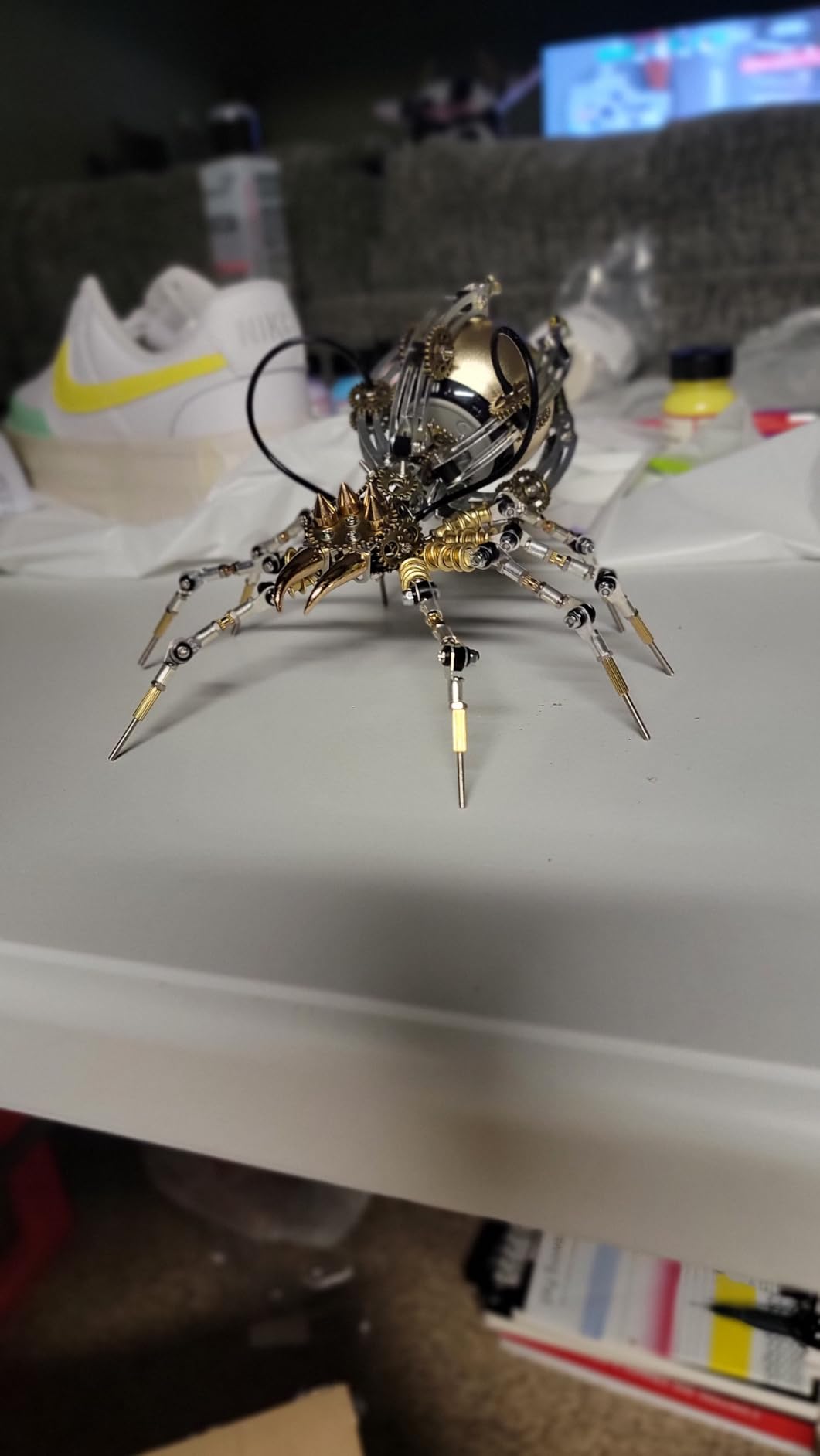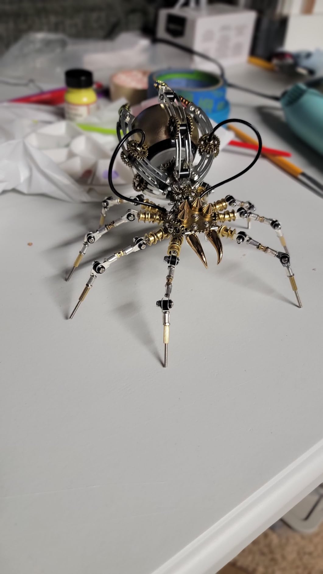 The completed spider model masterfully blends the aesthetics of mechanical construction with biological form.