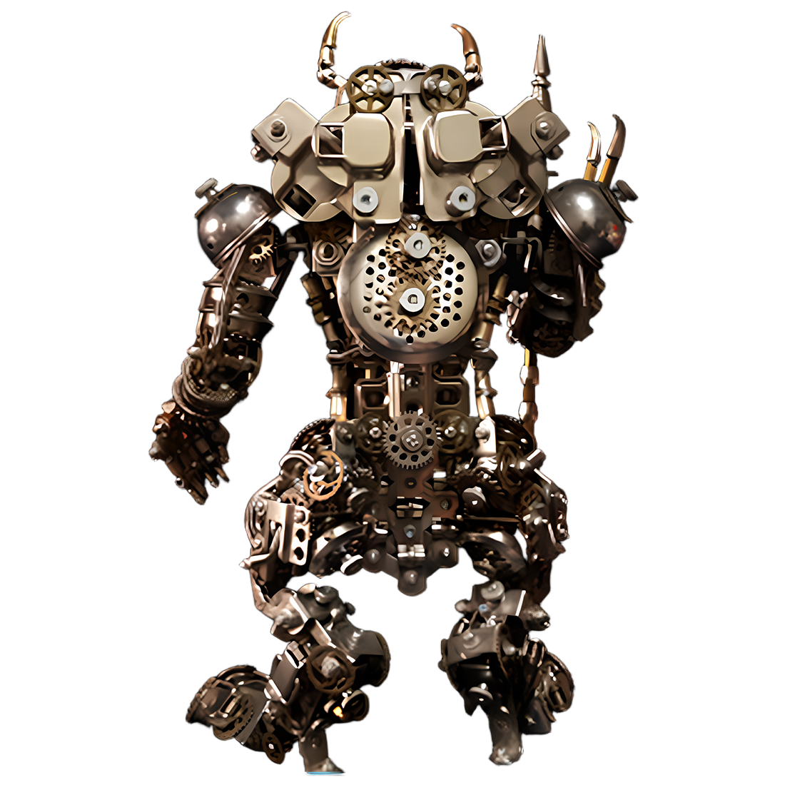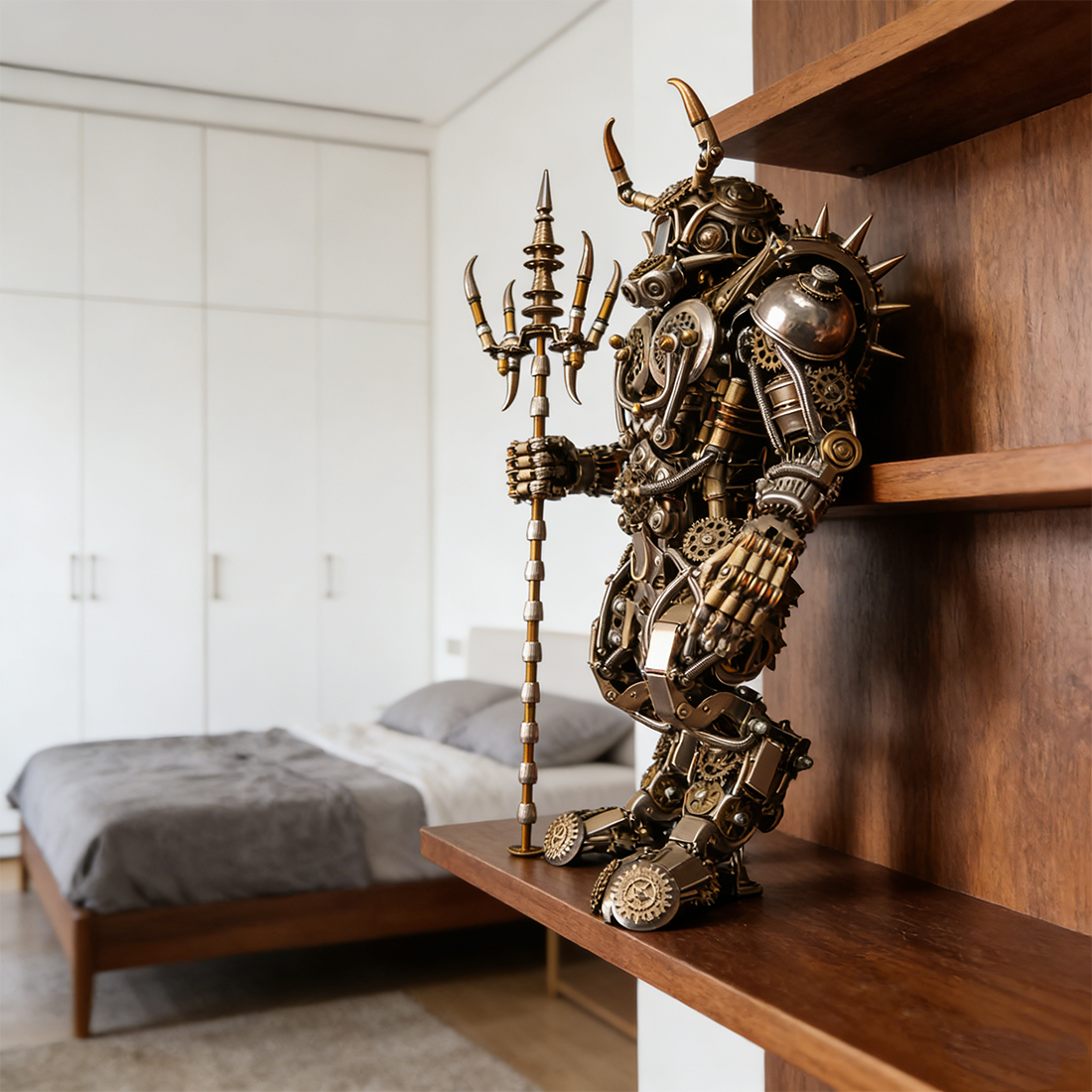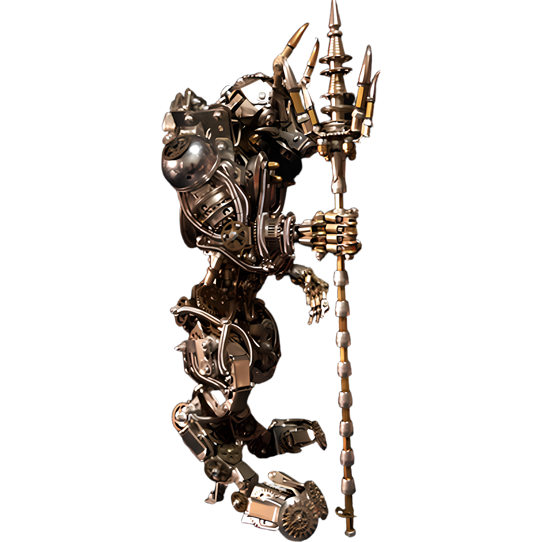 • Stunning Visuals, Meticulous Details: From the horns on the helmet and the mechanical core on the chest, to the muscle lines adorned with pipes and gears, and the magnificent trident held in hand, every detail is meticulously polished, exuding a strong industrial sci-fi aesthetic. The combination of metallic silver and bronze tones further enhances its vintage and powerful feel.