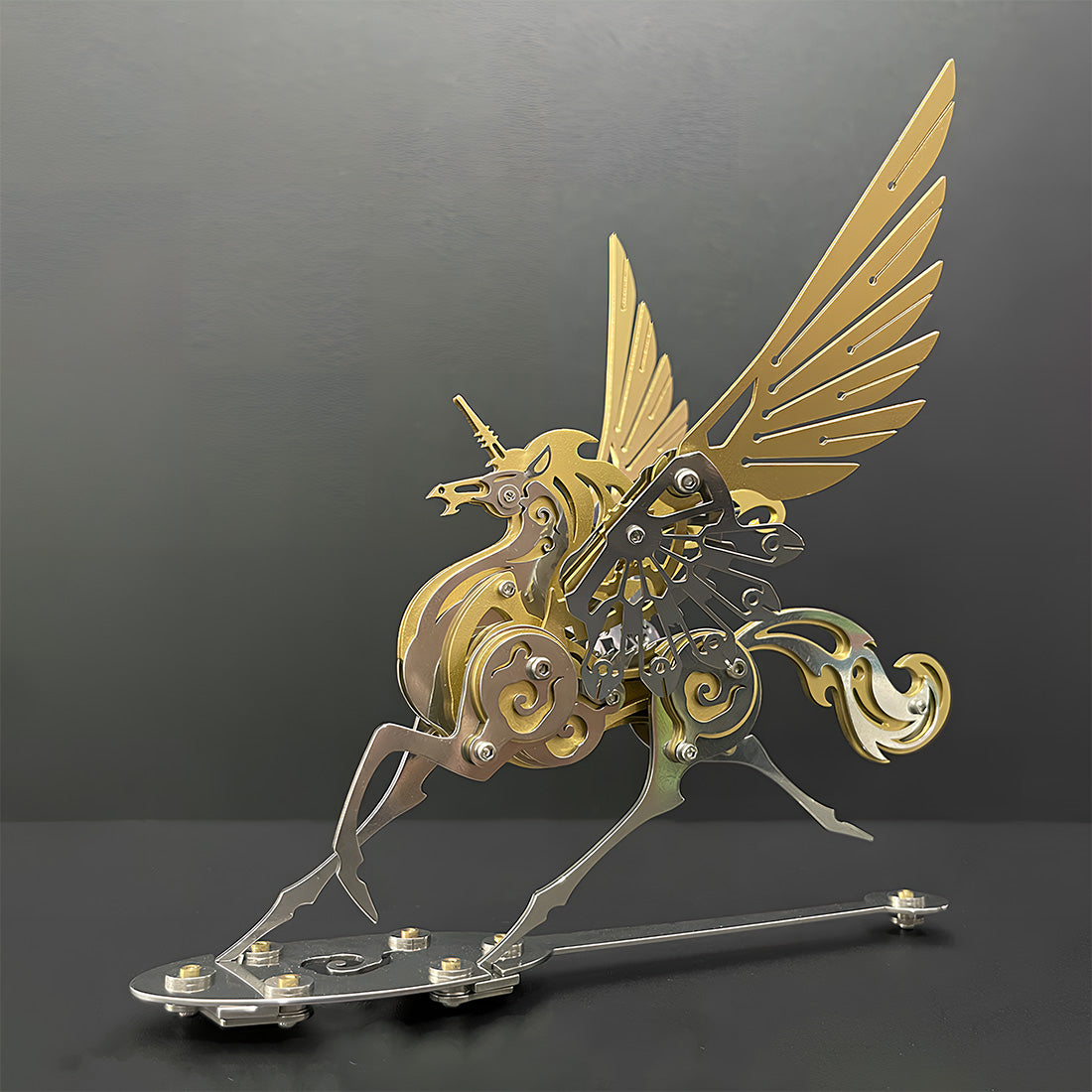 Exquisitely Detailed: The model boasts astonishing details, from its streamlined body contours to the feather-like wing textures, and the spiral horn and flowing mane. Every part is meticulously designed to capture the elegance and power of the unicorn within a mechanized style.